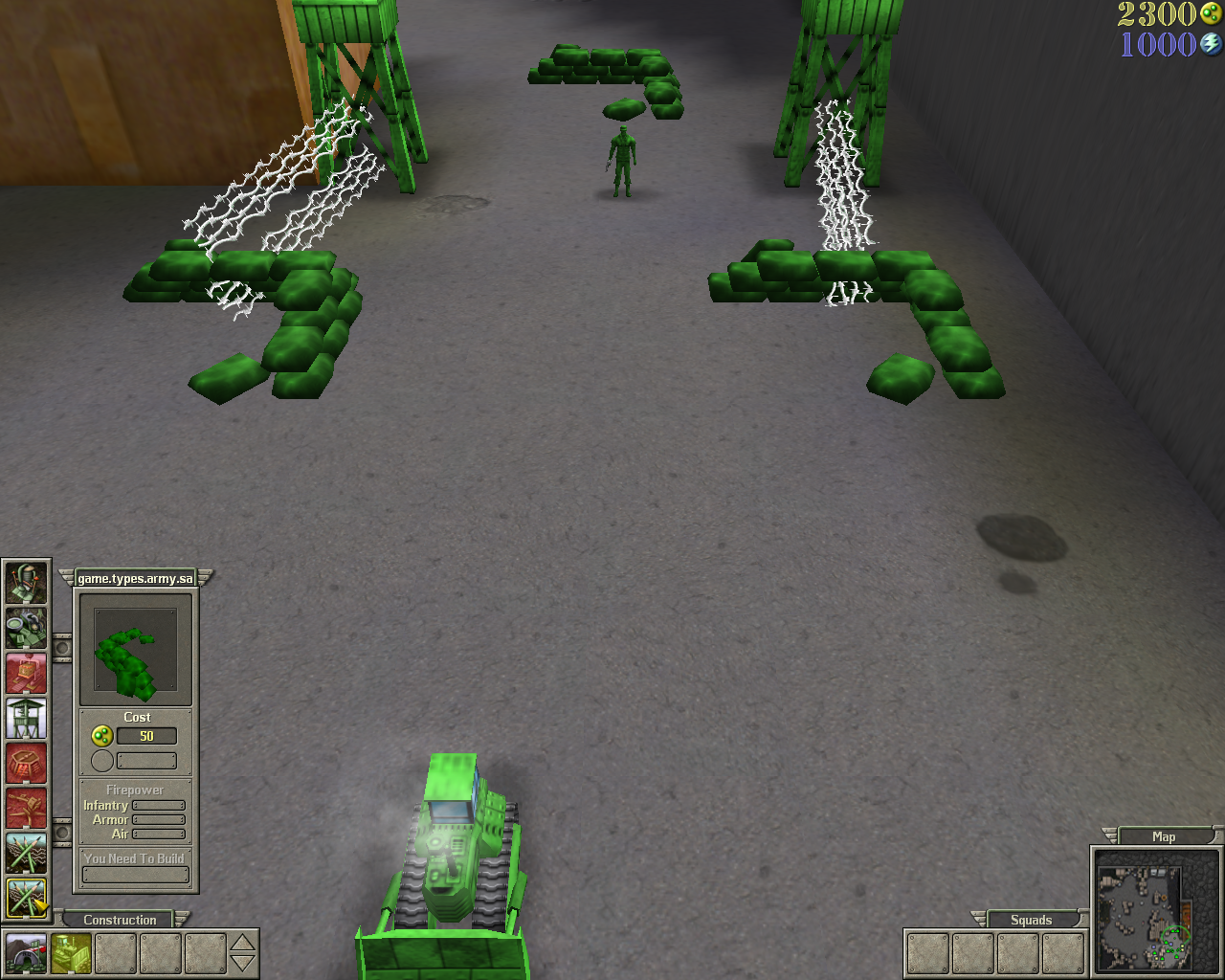 رجال الجيش: RTS " اللعب الصورة يتطلب اقتناء واستخراج الموارد اثنين للهياكل البناء والمركبات والجنود: البلاستيك و الكهرباء . البلاستيك ، المطلوب لكل بناء ، مأخوذ من أشياء مثل Frisbees وأطباق الكلاب والألعاب المنتشرة حول مستويات تتراوح من الفناء الأمامي إلى منضدة المطبخ وحتى الطابق السفلي. عند تدمير جسم بلاستيكي ، تُترك كتلة من البلاستيك خلفه حتى شاحنة قلابة ، جامع البلاستيك والكهرباء ، يكسوها ويقذفها. يتم سحب الكهرباء من البطاريات والمحمصات وأجهزة اتصال لاسلكية. يتوقف بناء وترقية معظم المباني وبعض الجنود على بناء بعض المباني. على سبيل المثال ، في بداية اللعبة ، يجب بناء مستودع الموارد ، مرفق المعالجة ، بحيث يكون للشاحنات القلابة مكان ما لتفريغ مجموعاتها.